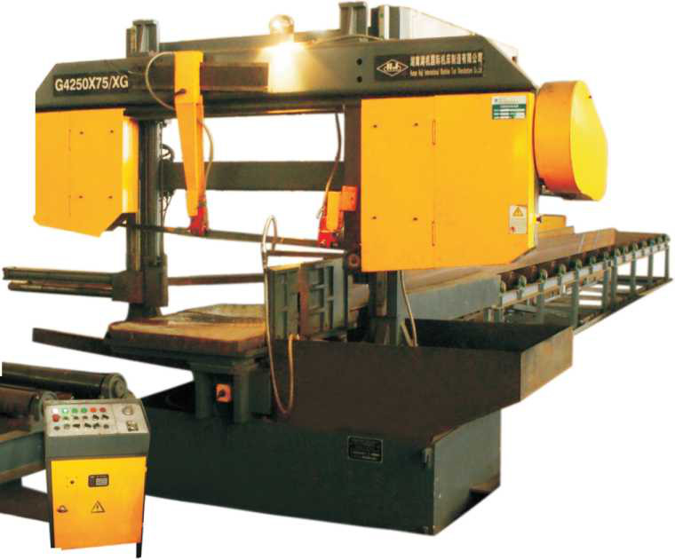 G4250XGの鋼鉄コラム主にいろいろな種類のセクション鋼鉄および管材料を、角度の鋸引き機能と、狭いフランジ鋸で挽くために使用される、横のバンド鋸引き機械、物質的なセービング、省エネ、高い切断の精密、安全な操作、便利で、高い生産の効率。